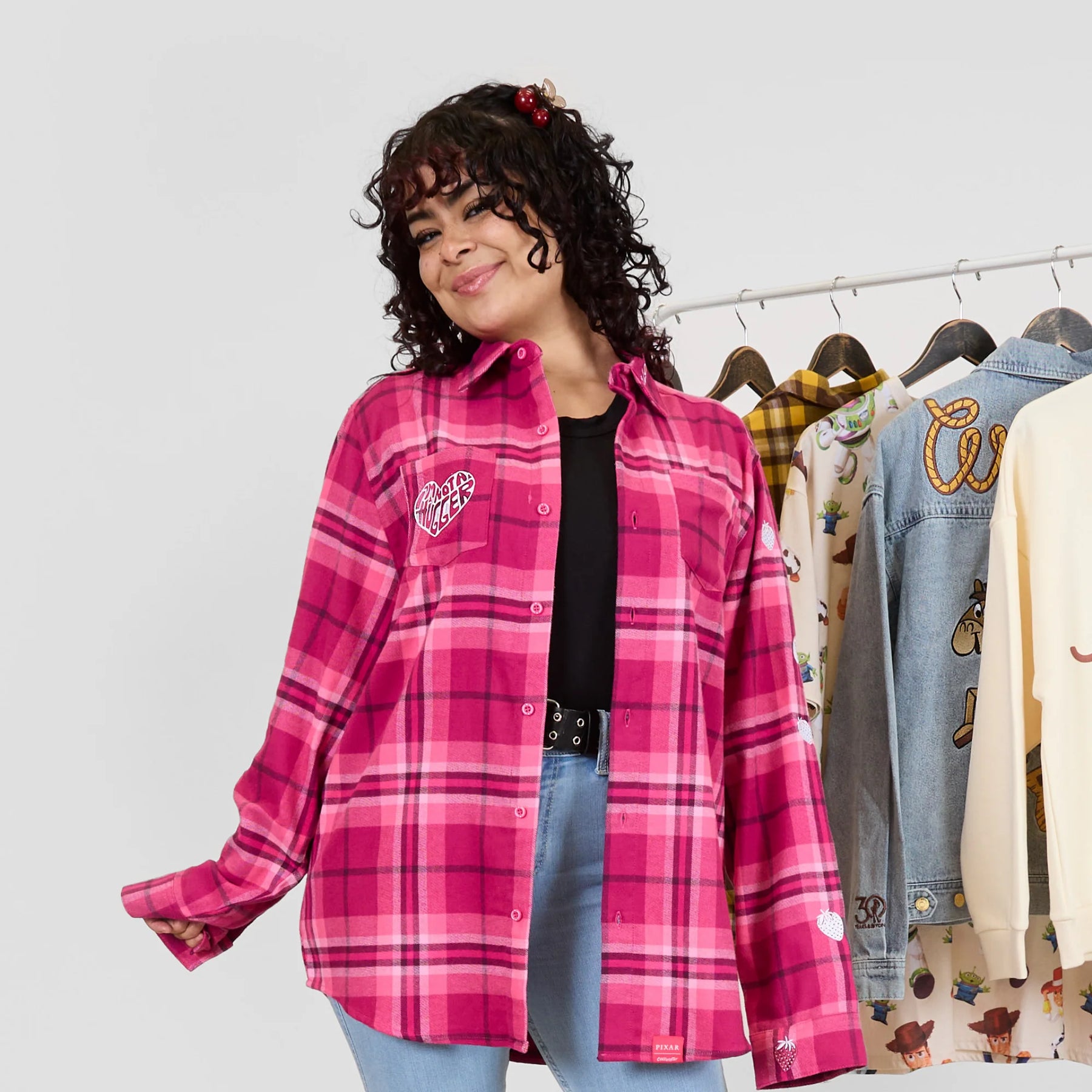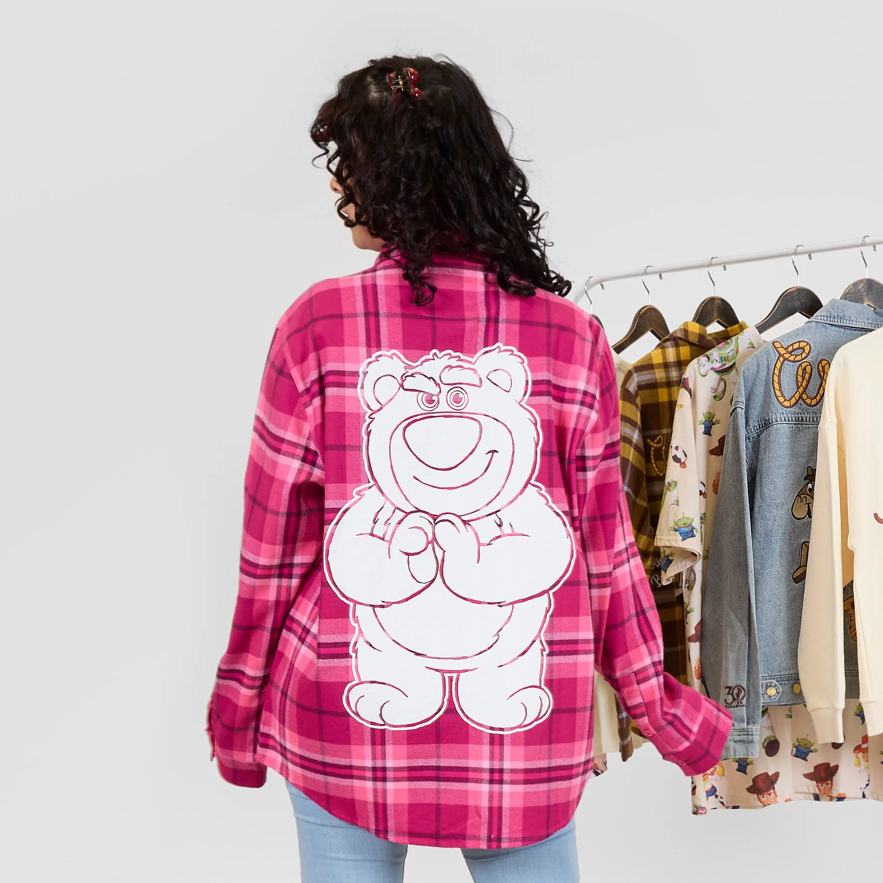 You’ve got a play-date with our newest flannel! Sweet meets sinister with our scented Disney and Pixar’s Lotso Flannel. Featuring a pink palette inspired by the villainous bear, this flannel includes details that fans will love, like embroidered strawberries down the sleeve, Lotso’s autograph on the collar, “I’m Not A Hugger” on the pockets and a printed graphic of Lotso himself on the back. Oh, and did we mention it’s strawberry scented?