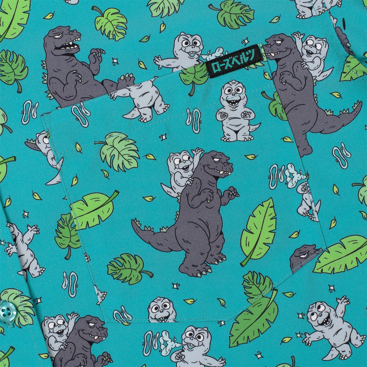 It’s “Bring Your Child to Shirt Day” on this button down blast featuring Godzilla and everyone’s favorite adopted son, Minilla, having some good ol’ fashioned family fun… and probably causing some serious unintentional collateral damage.