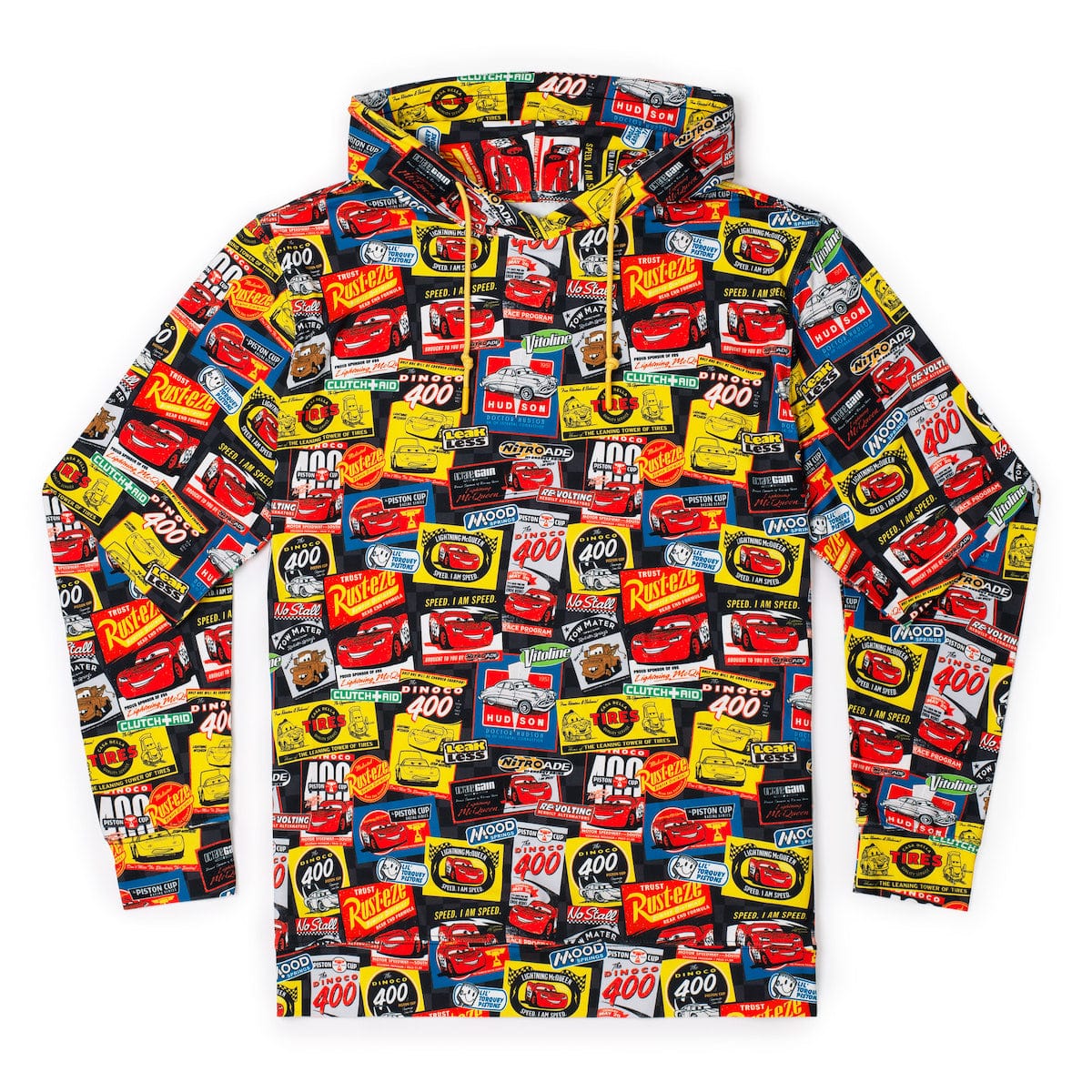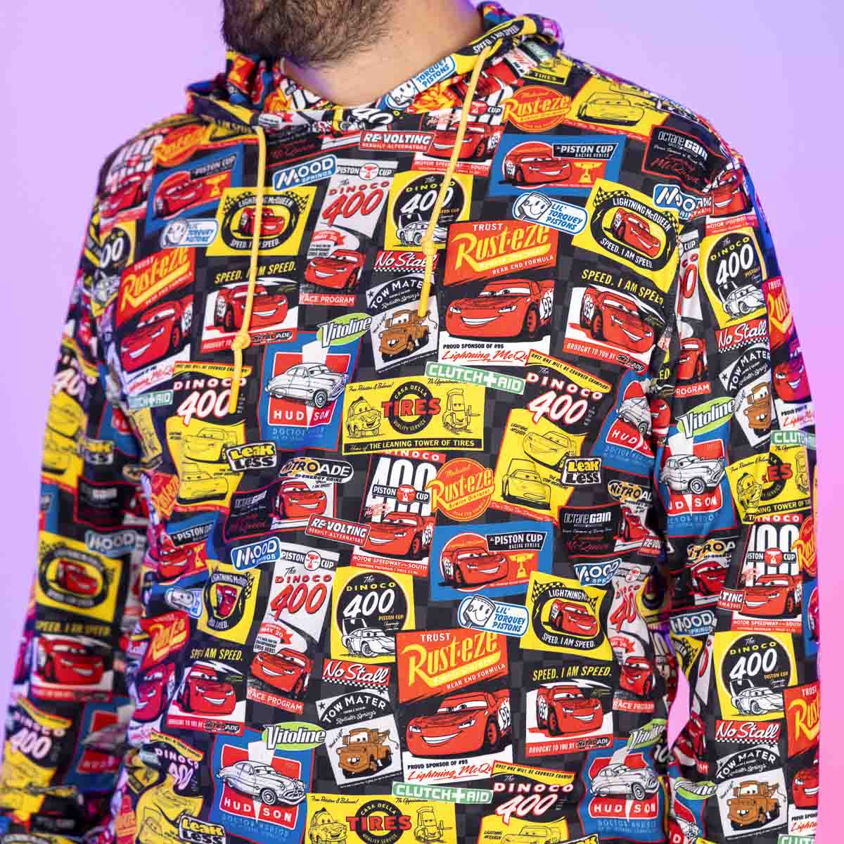 Take a metaphorical ride through the wide world of Disney and Pixar’s Cars with this hoodie covered bumper-to-bumper in advertisement-style depictions of companies seen throughout the film. From Rust-Eze to Dinoco and many more, you’re gonna feel like a walking billboard… for people with great taste in movies.