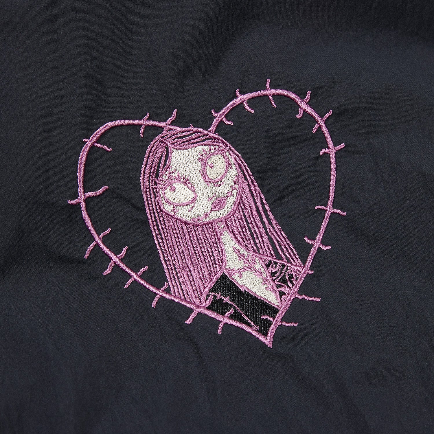 This windbreaker has a pink-and-black take on Sally's ensemble. The torso of the jacket is half pink and half black, and the sleeves feature pink embroidered details in the same style as Sally's dress. The hood is pink. You'll also find an embroidered image of Sally inside a heart in the upper right corner!