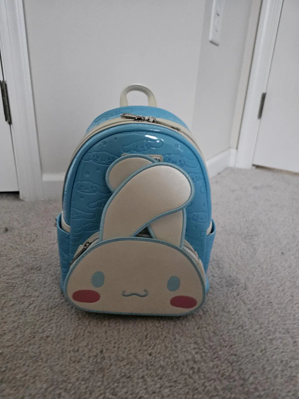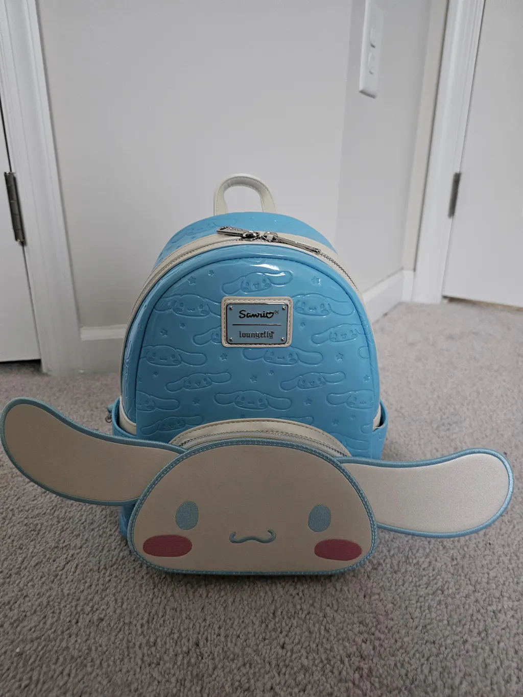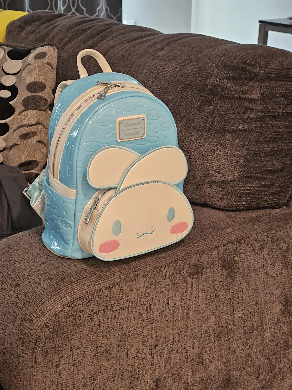 Introducing Grotto Treasures Exclusive - Loungefly Sanrio Cinnamoroll Moveable Ears Mini Backpack. With its Cinnamoroll face on the front pocket and moveable ears, this limited edition backpack is a must-have for fans. Featuring an all-over print and debossed details, it's a unique and collectible item.