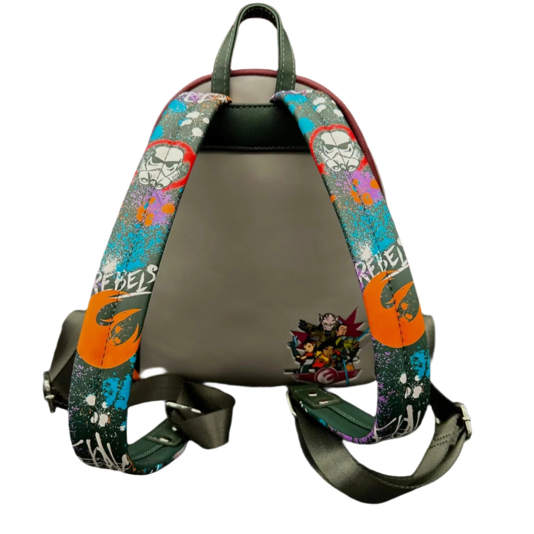 Artwork of Sabine takes one of the side pockets in a nod to one of her shoulder pads and on the back, she is pictured with the Ghost crew beneath adjustable straps exploding with her artistic expression.